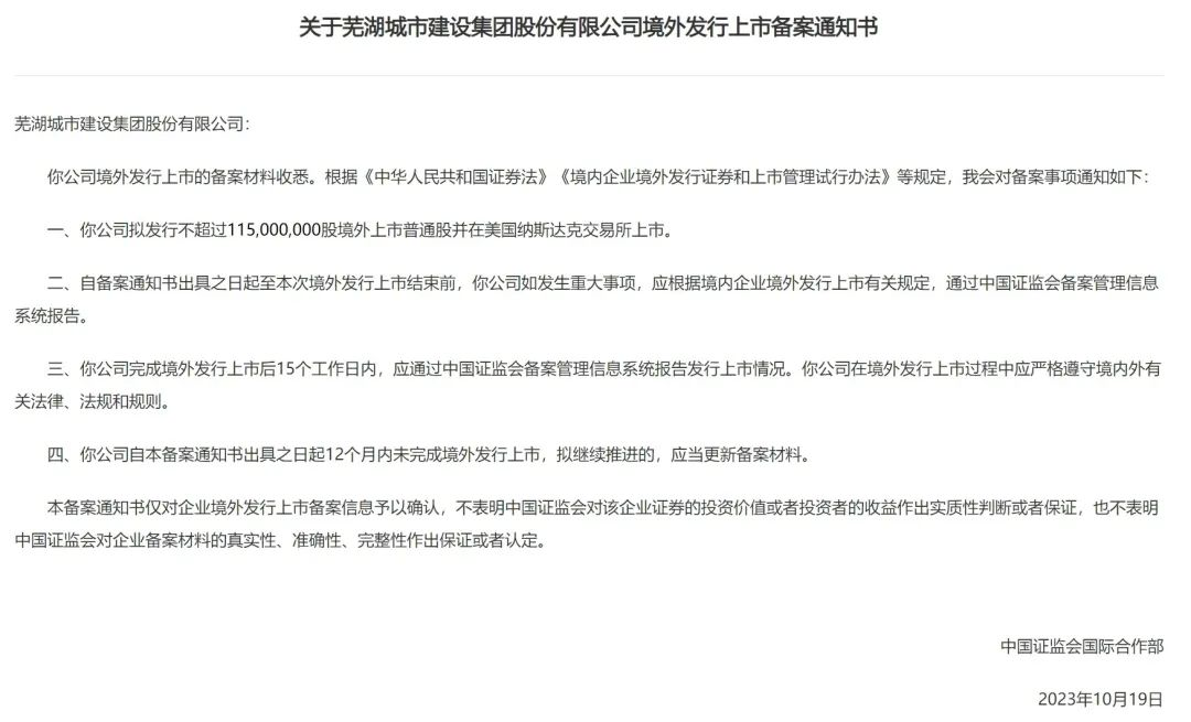10月19日,中国证监会发布关于芜湖城市建设集团股份有限公司境外发行上市备案通知书,该公司拟发行不超过1.15亿股普通股并在美国纳斯达克交易所上市...